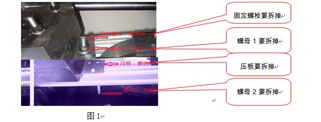 ⑴ 卸下固定螺母1后,把平垫和弹簧垫取下→⑵取下压板→⑶松开螺母2→⑷拧下固定螺栓。