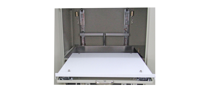 试验完成后,一般可把活动托板处于打开待工作状态,如果仪器长期不用而需要关闭前门,需要将活动托板复原到初始位置,方法如下。